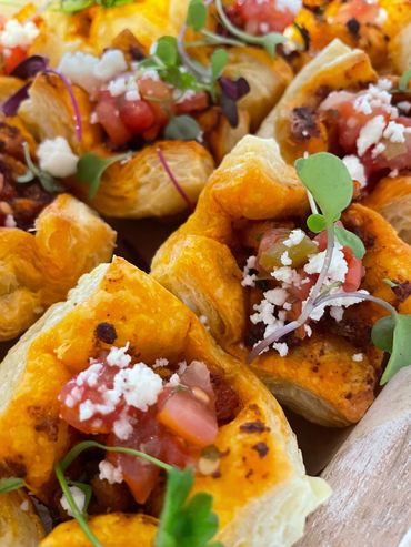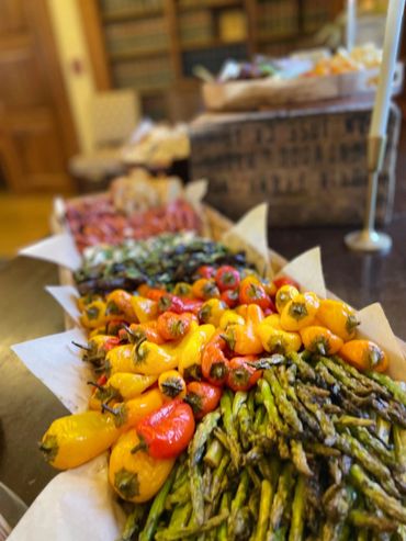 assortment of roasted baby vegetables, hummus & tapenade served with our housemade grilled flatbread, 2 dozen red pepper and walnut tarts, 2 dozen savory apple & onion pinwheels (made with vegan feta)