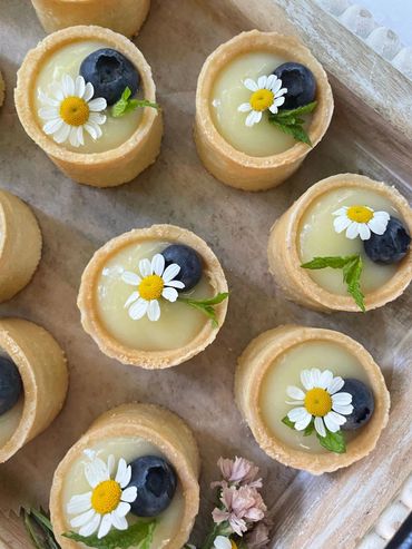 baked sweet cookie crust, fresh lemon curd, garnished with fresh flowers.