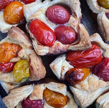 3" heirloom tomato tarts, baked in a puff pastry shell. perfect for vegetarian side item, brunch item, or an easy lunch with a beautiful buttercup salad.