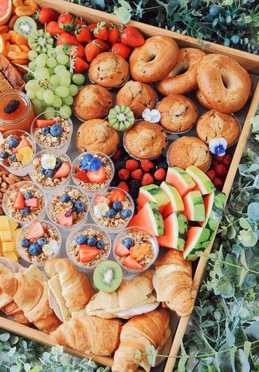 fresh fruit, mini yogurt parfaits, sweet breakfast quick bread (blueberry, lemon poppy seed or cinnamon streusel), bagels, mini croissant sandwiches, honey, orange marmalade, small brie wheel.